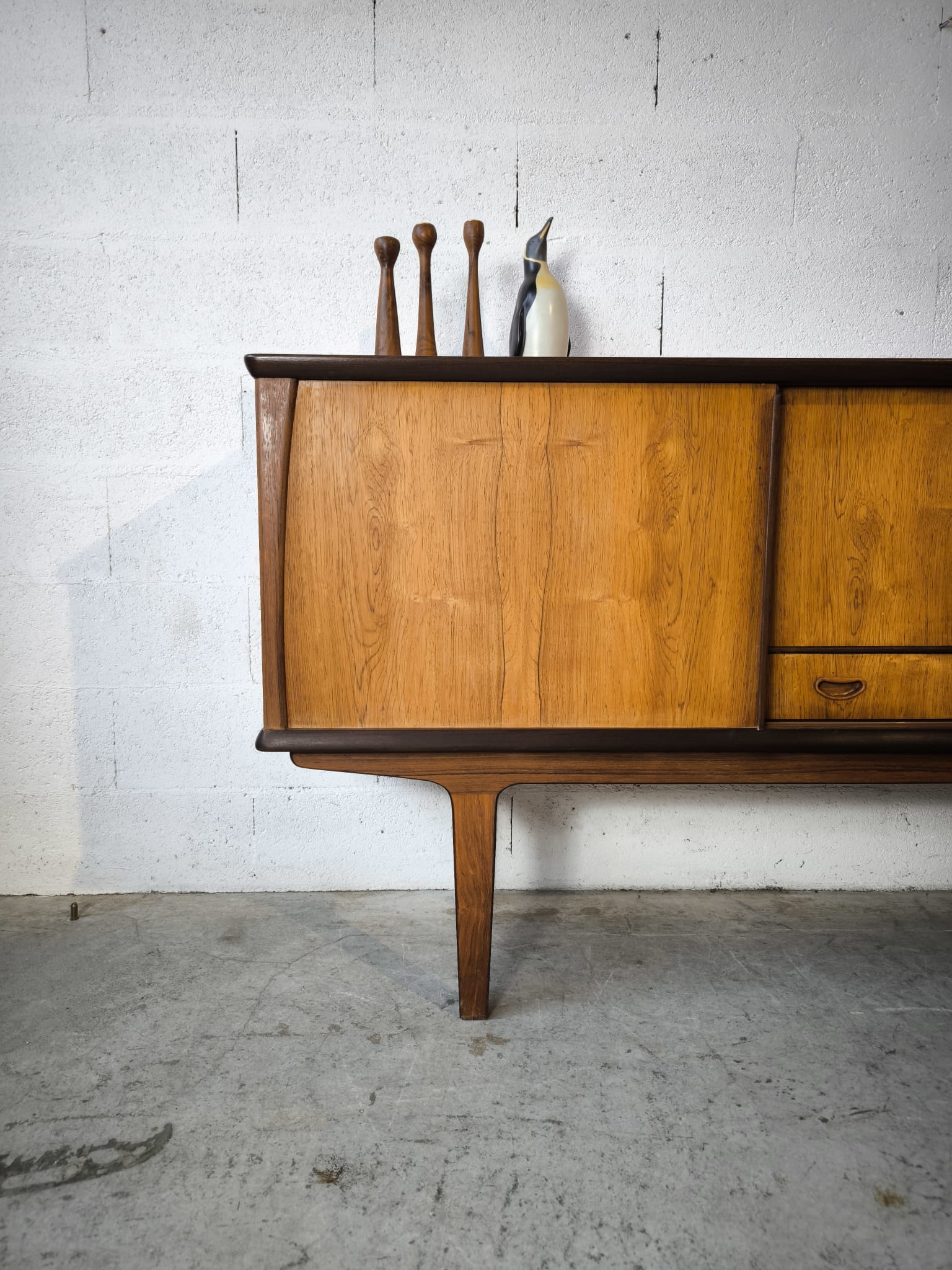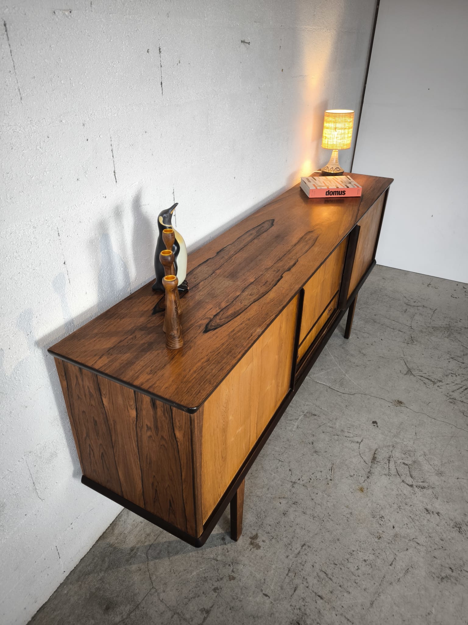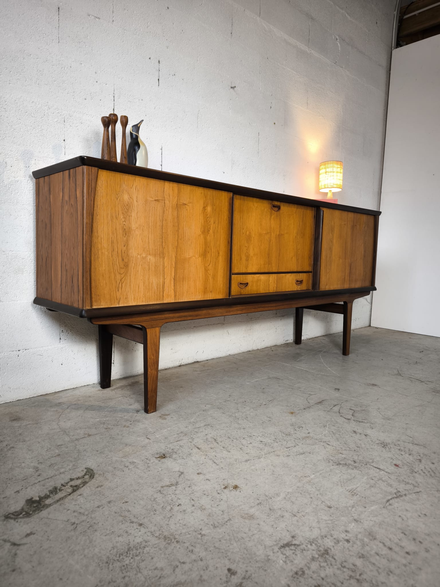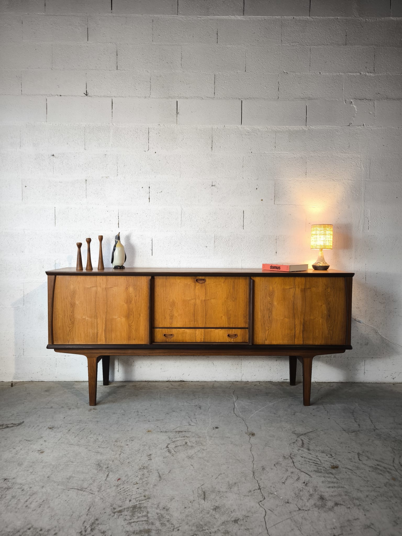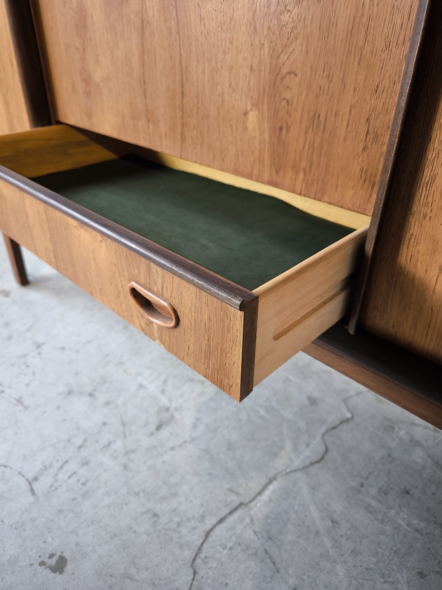 2 portes coulissantes, 1 tiroir central et une porte battante avec étagère.
