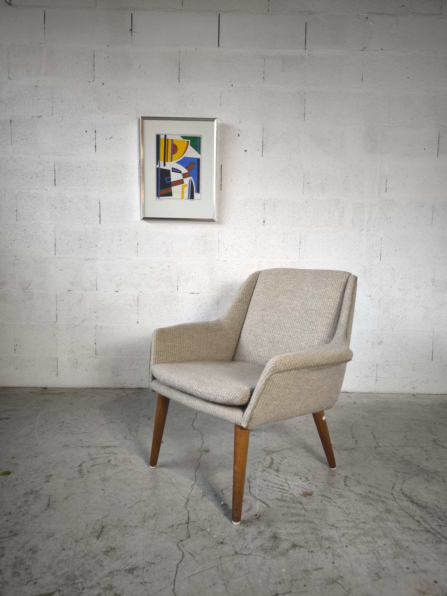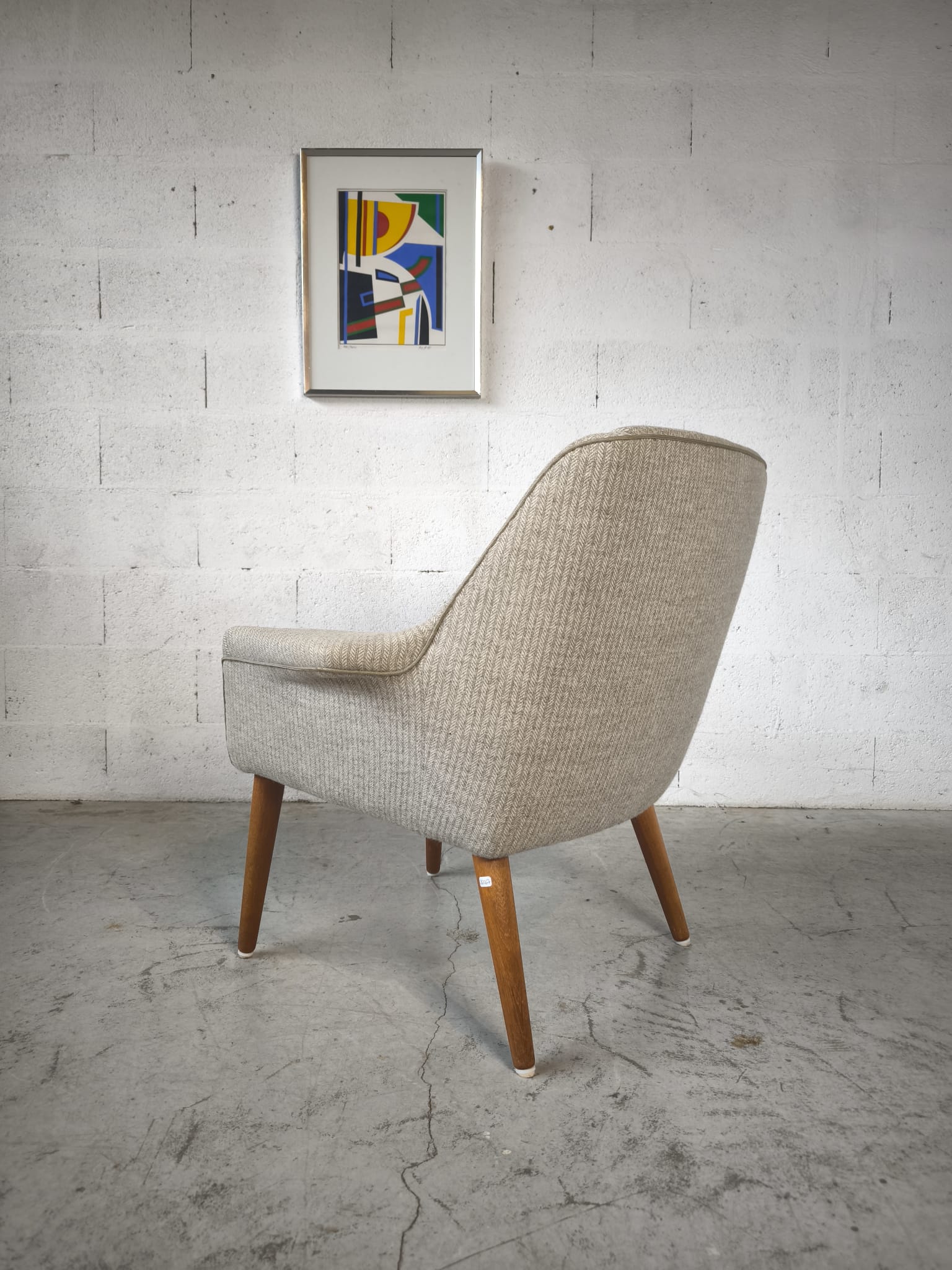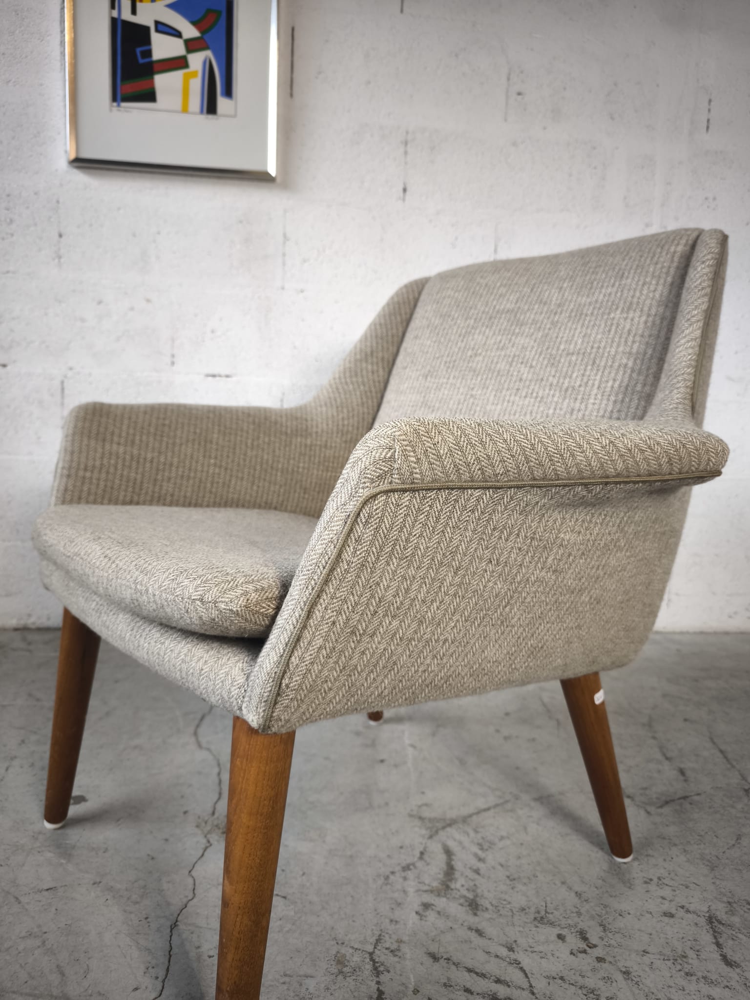 Fauteuil danois, tissu d’origine et pieds en teck